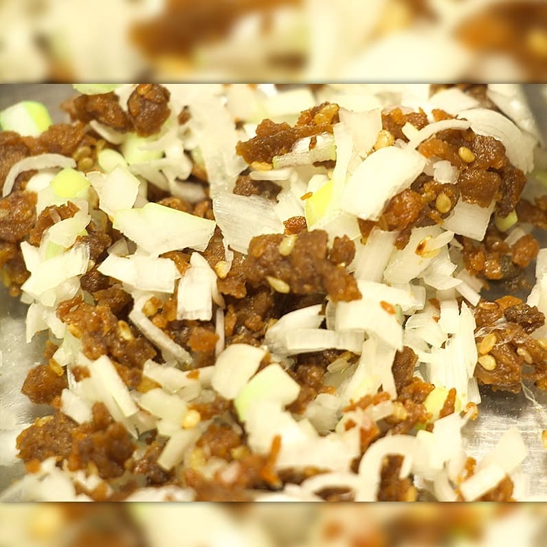 ①牛タンしぐれ大さじ2とみじん切りにしたネギ(1/4本)を混ぜる