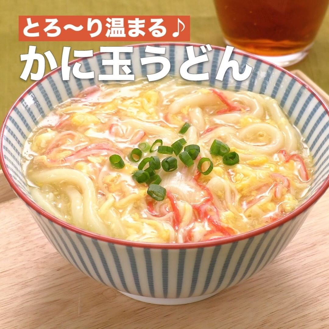 とろみをつけたうどんに、かにかまぼこでお手軽に作るかに玉を流し入れて、ふんわりとじます♪かにかまぼこと卵の色が鮮やかな一品です。