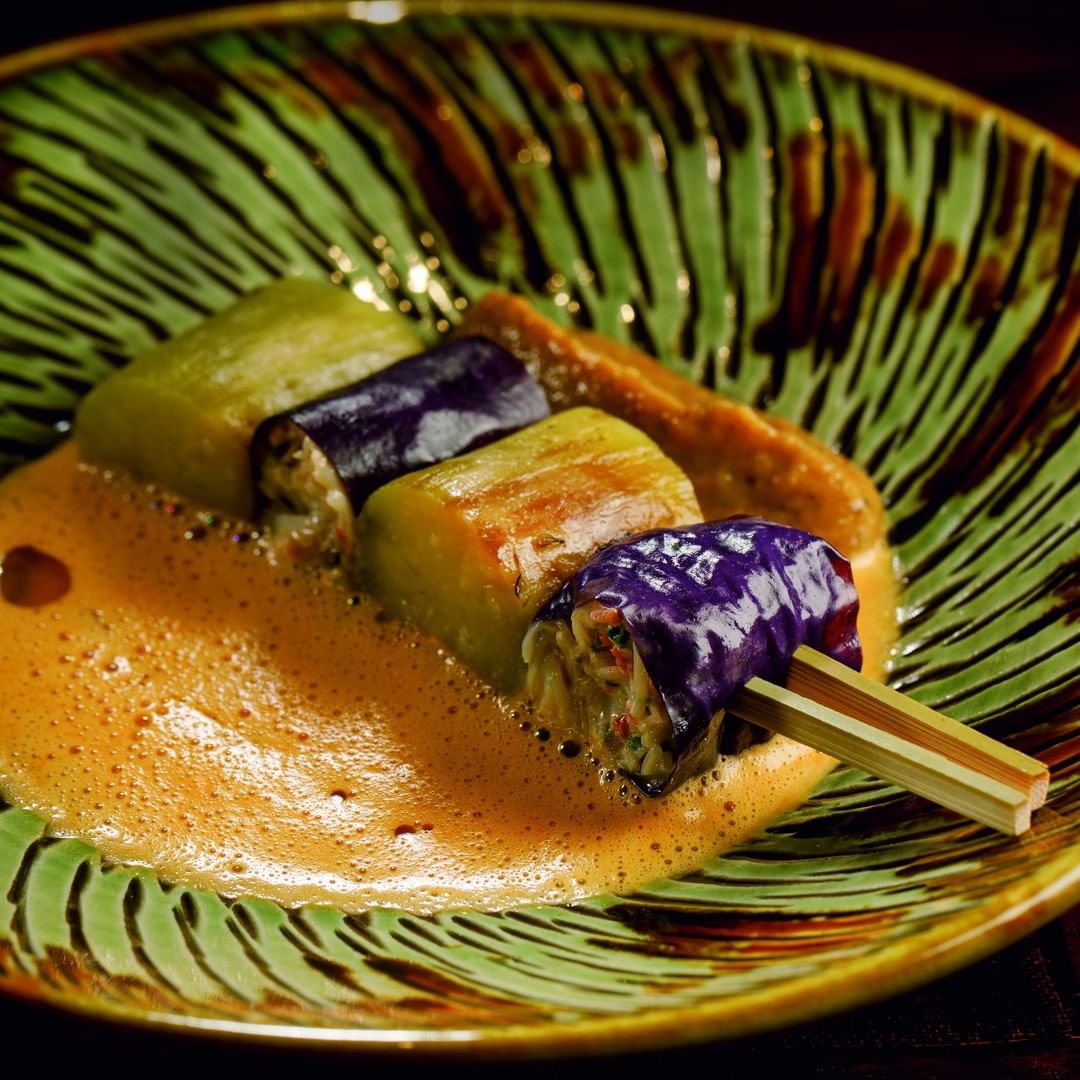 写真①▷「 なす 蟹」は温かいナスのピューレとカニのビスクソースで
