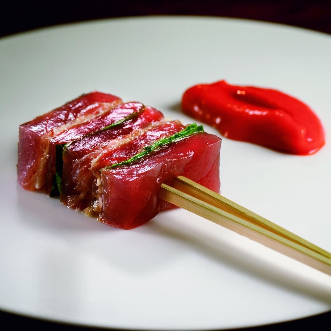 漬けにしたフィレとタルタルの鰹を、しそ、みょうがと串に。