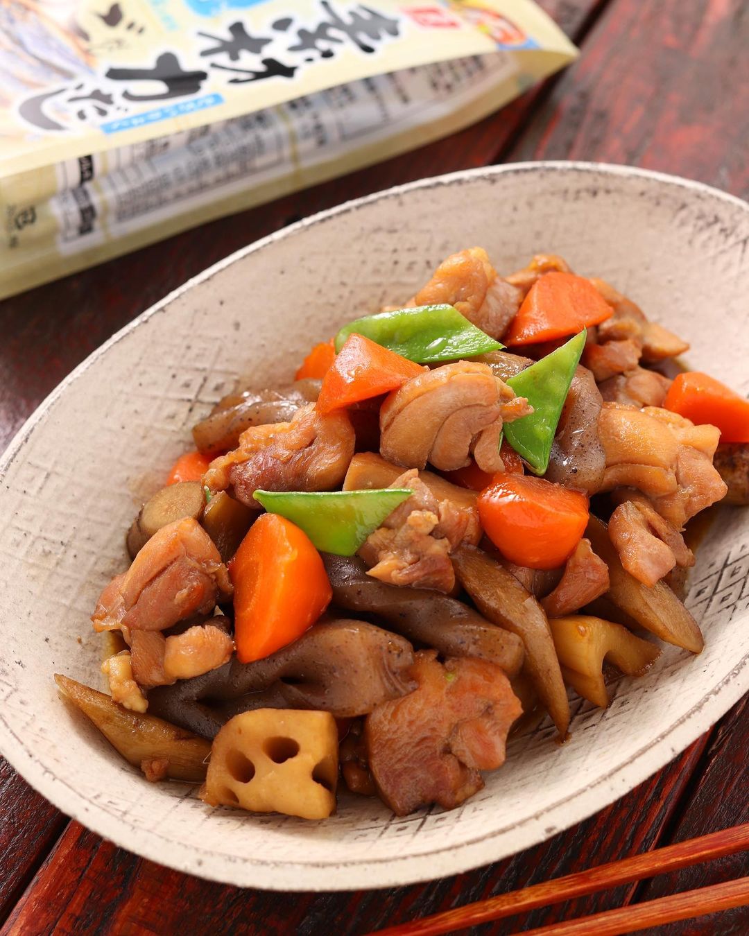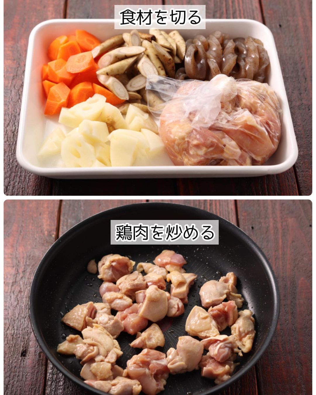 ➋フライパンにごま油を中火で熱し、鶏肉を炒める。鶏肉の色が𝟾割がた変わったら、れんこん・ごぼう・にんじん・板こんにゃくを加えてさらに炒める。