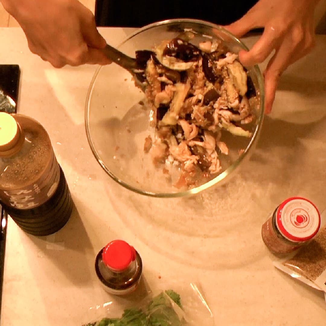 ③ささみをほぐして、加熱した茄子、みじん切りにした長ネギ(1/6本)とザーサイ(15g)を入れて、胡麻(大さじ3)をひねりながら入れる