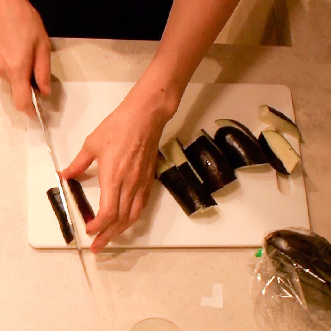 ②茄子(2本)を一口サイズに切り、ラップをして電子レンジ(600W)で5分加熱する