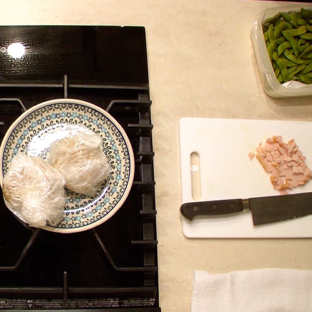 ②きゅうり(1/2本)を薄切りに、ハム(3枚)を1cm角に切っておく