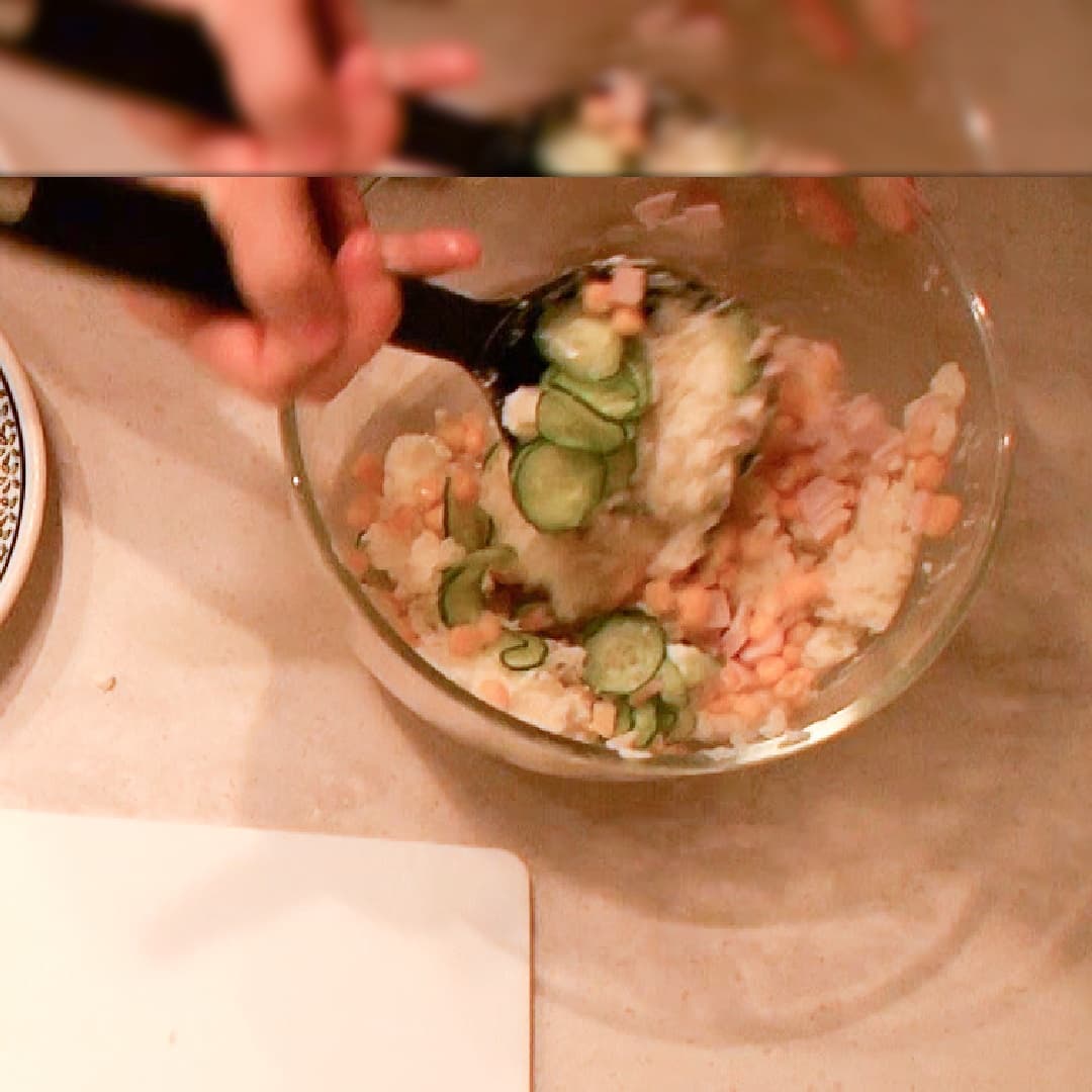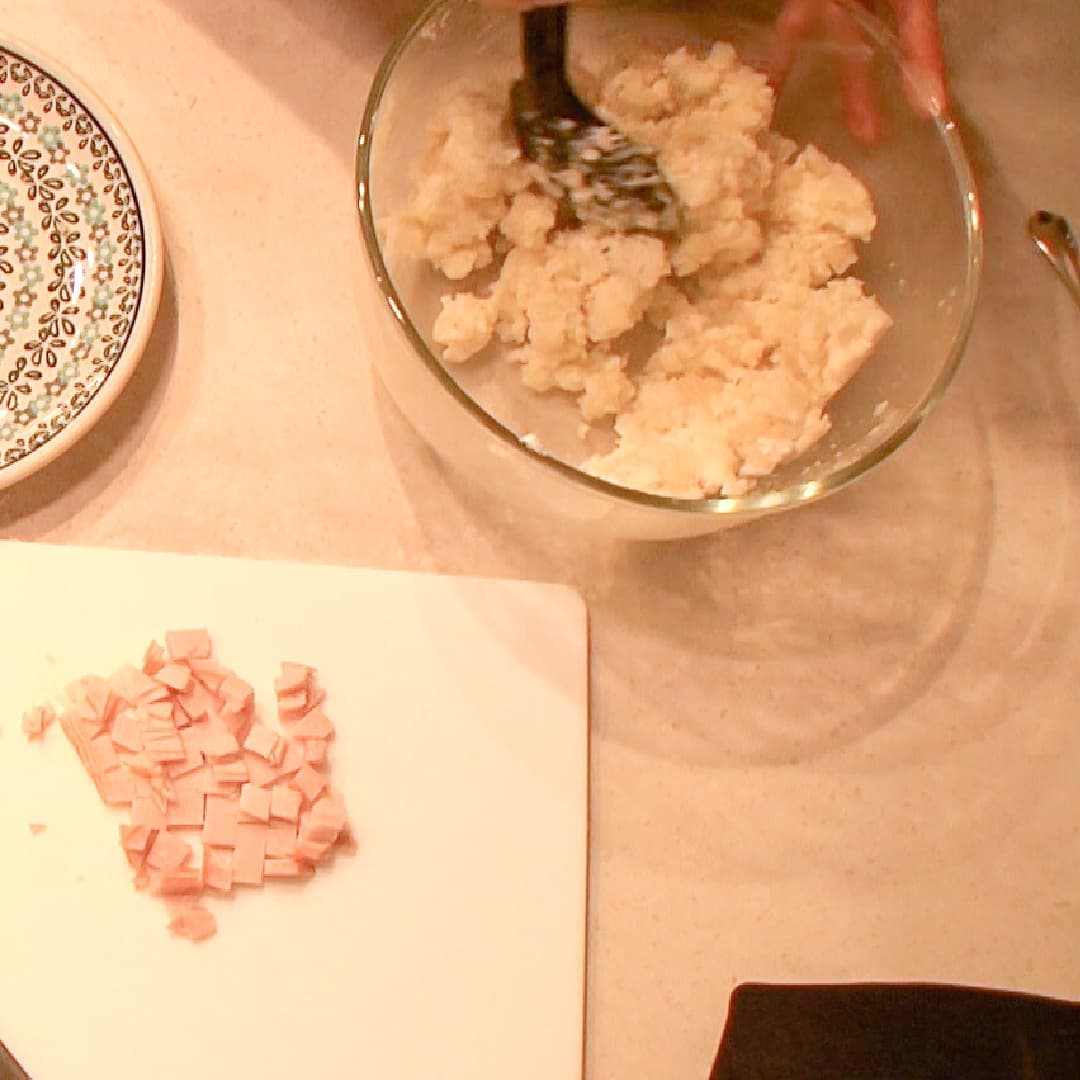 ③じゃがいもの皮をむいて潰したら、ブルサンチーズ(1個)を入れて、全体を混ぜ合わせる