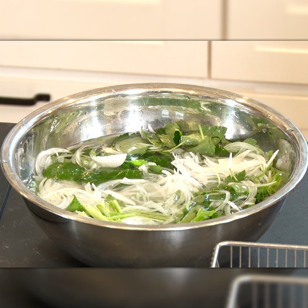 ①三つ葉(1束)をざく切り、玉ねぎ(1個)を薄くスライスし氷水につける
