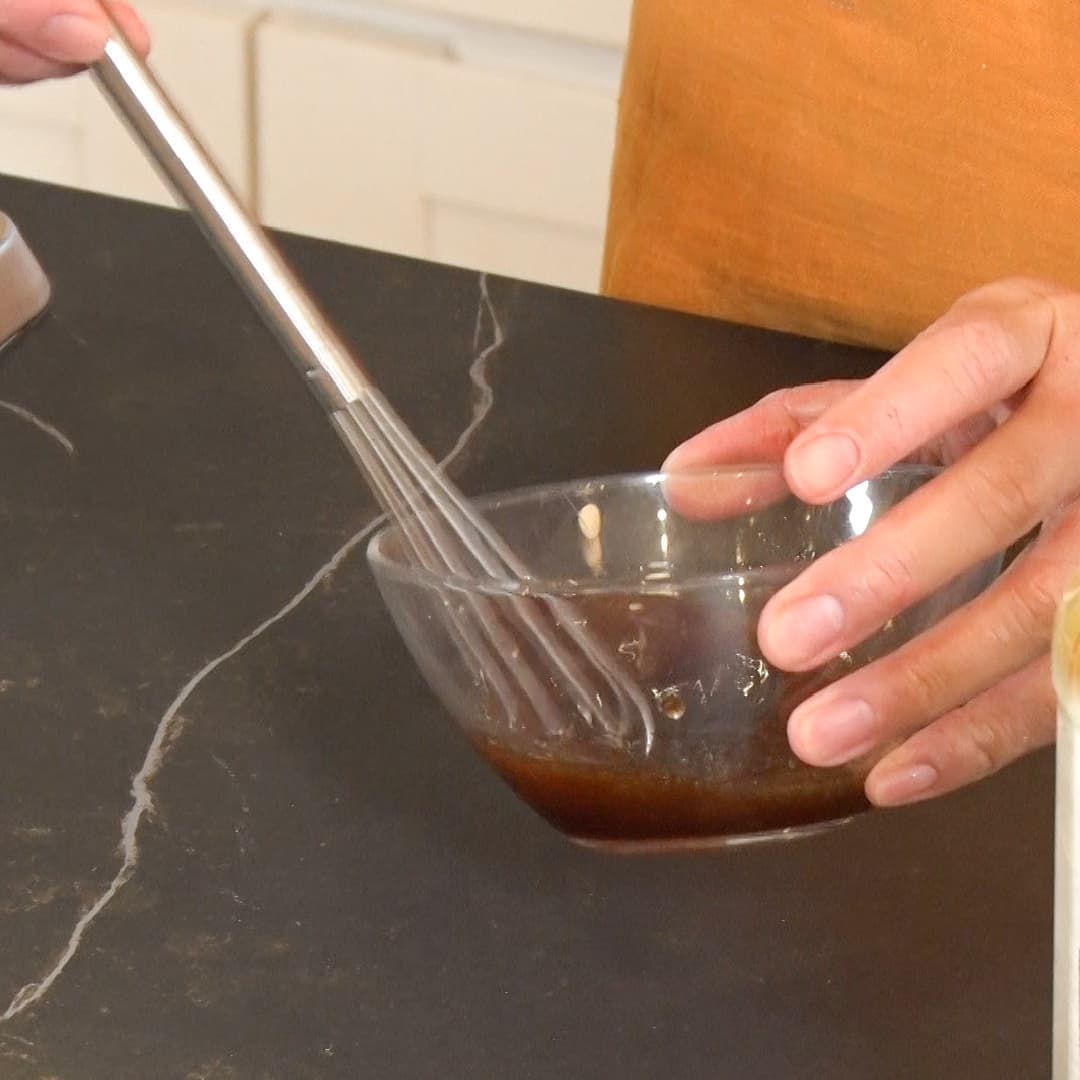 ②ポン酢(大さじ1.5)とめんつゆ(大さじ1.5)を混ぜ米油(大さじ2)を入れコクを出す