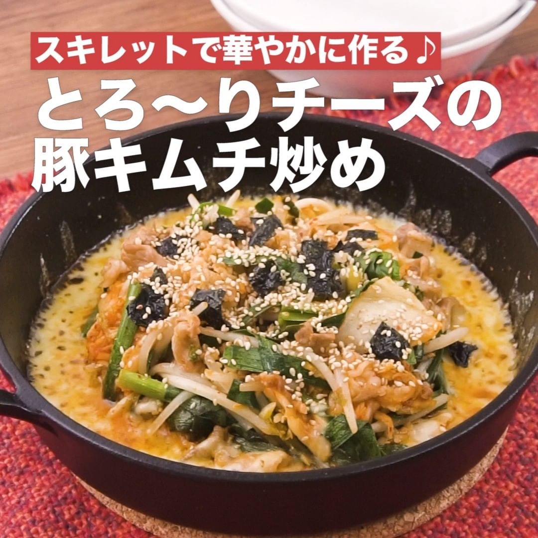 ③<スキレットで華やかに作る♪とろ〜りチーズの豚キムチ炒め>