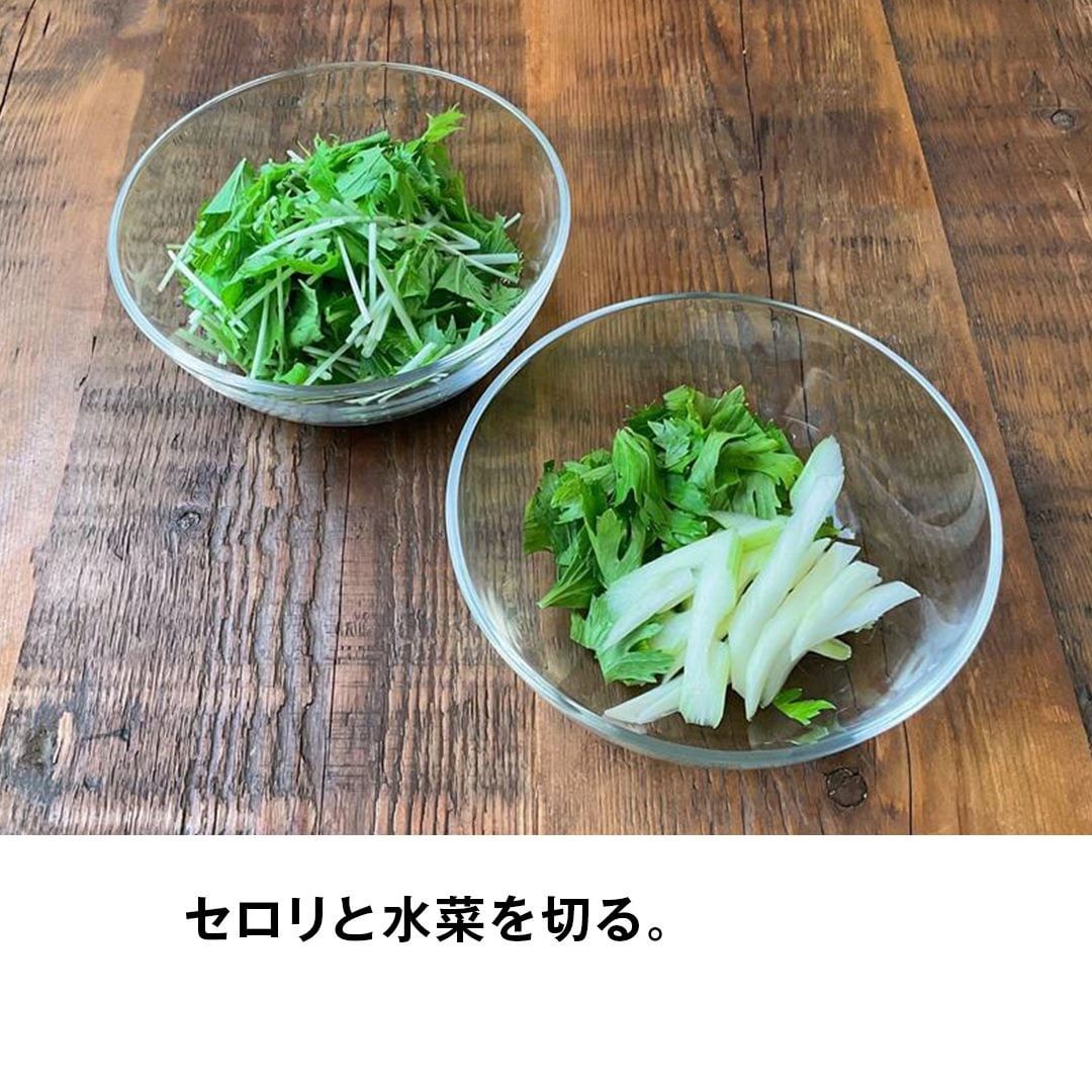 3.セロリの茎は筋をとり約5mm幅に斜めに切り、葉は約2cm幅に切る。水菜は約4㎝の長さに切る。