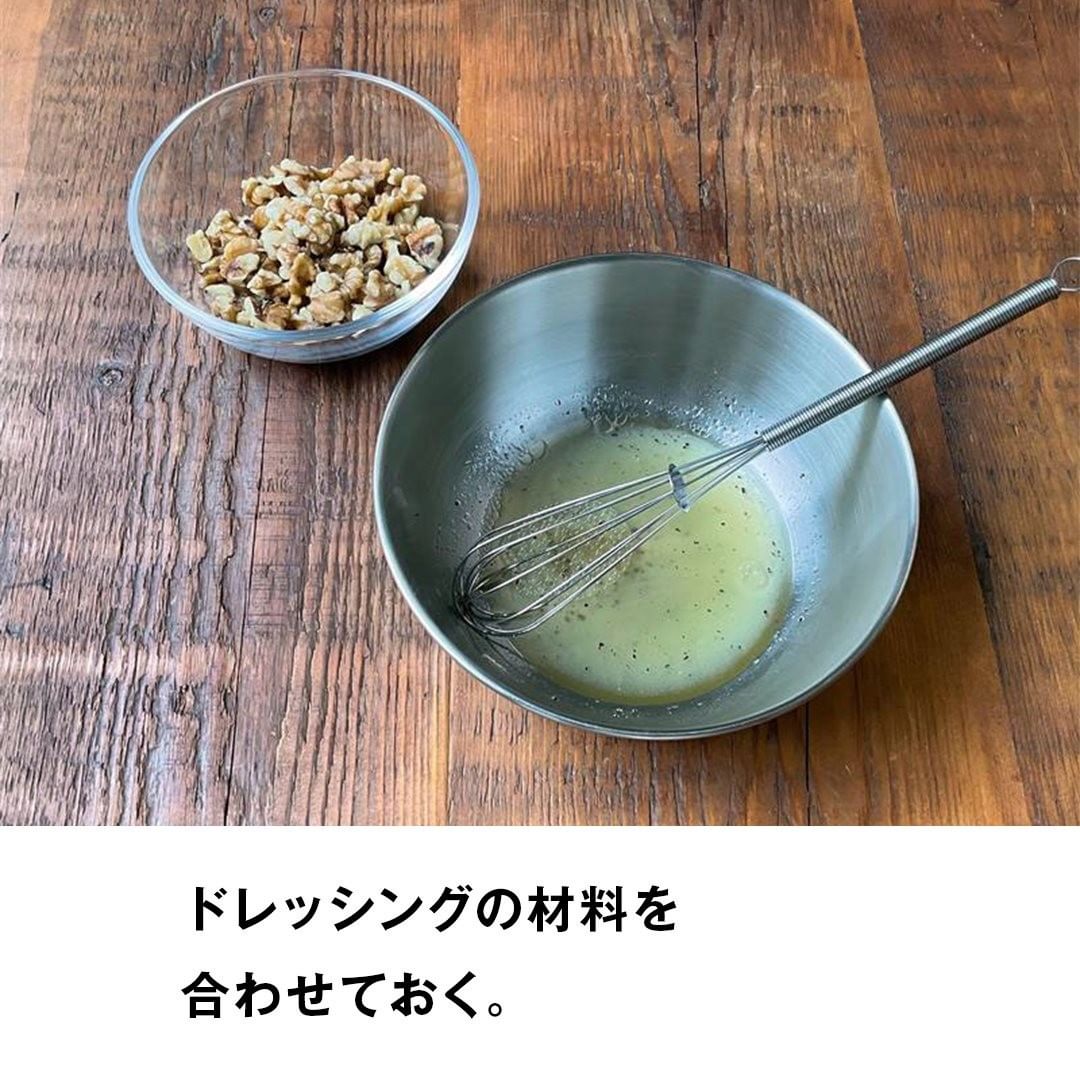 1.ドレッシングの材料をすべて混ぜ合わせておく。くるみは手で半分程度に割る。