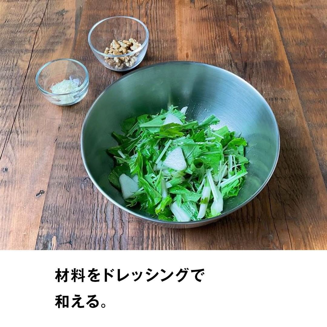 4.梨、セロリ、水菜に1.のドレッシングを加え、和える。