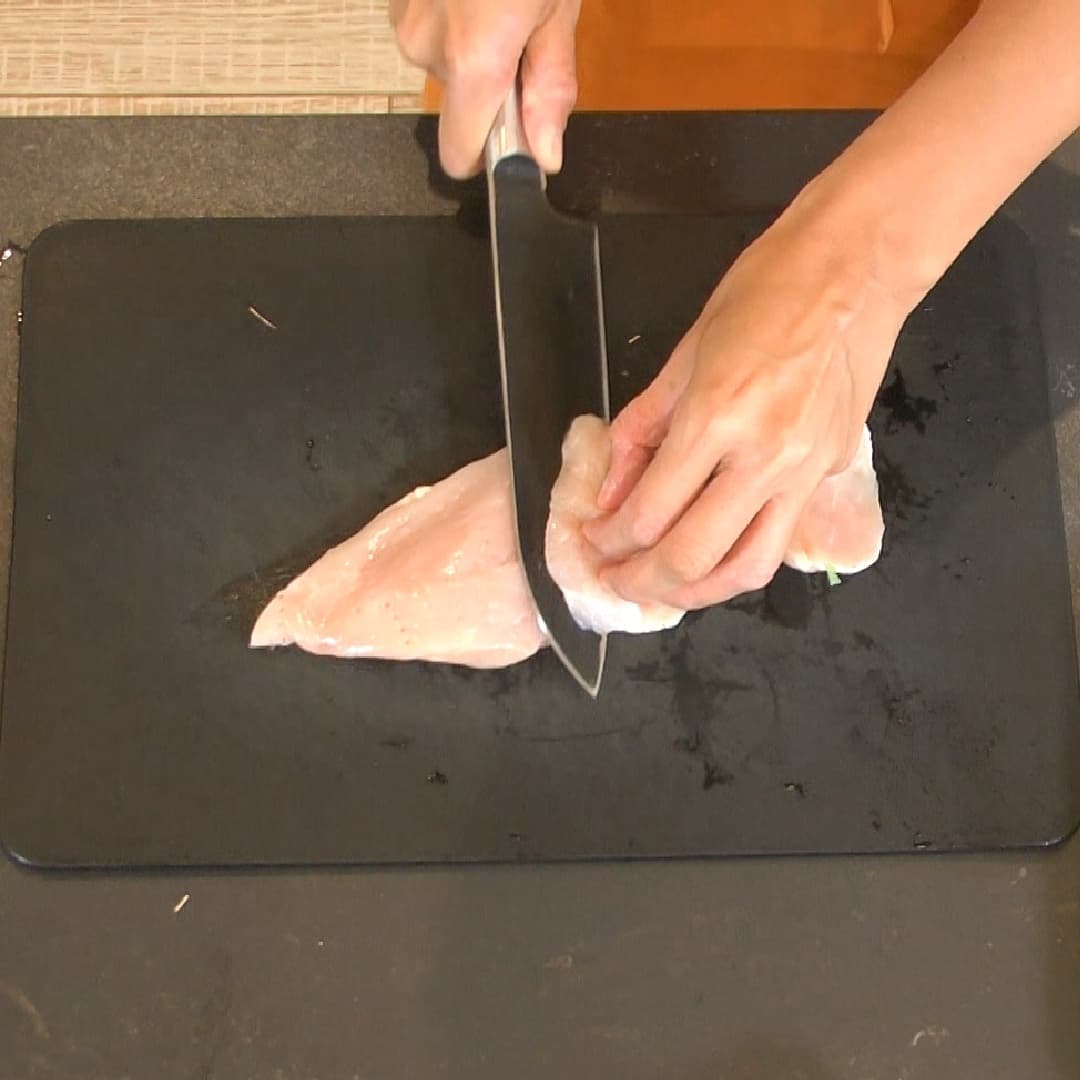 ①鶏肉(モモ150g、胸150g)にフォークで数ヵ所穴を開けそぎ切りする