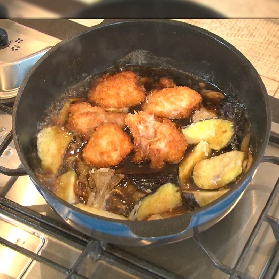 ⑥少量の油で揚げ焼きにし④に舞茸と茄子を入れる