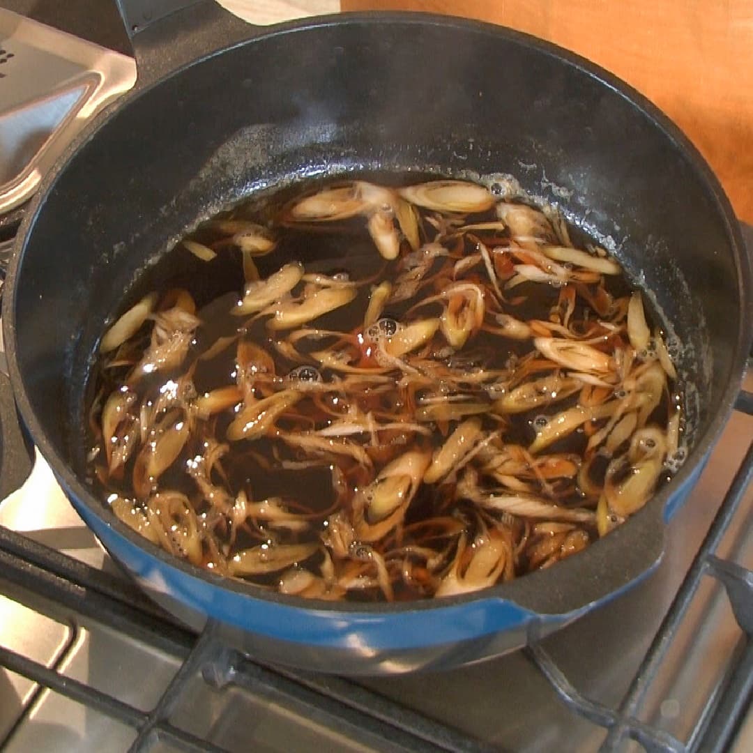 ④味噌汁の昆布出汁を(1カップ)とって鍋に入れ、酒(大さじ3)みりん(大さじ3)しょうゆ(大さじ3)砂糖(大さじ1〜2)を加え沸かす
