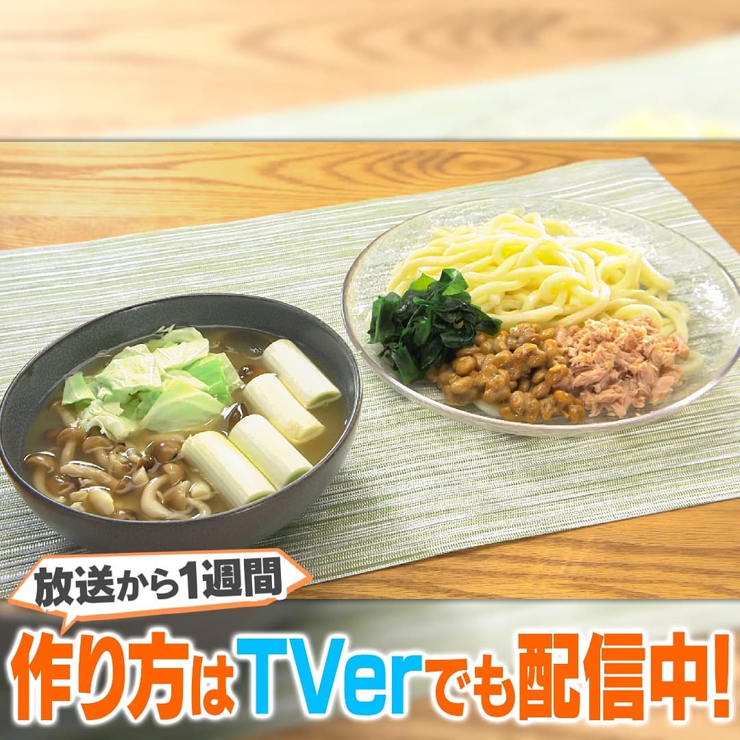 ②うどん(1玉)は茹でてから水でしめ、皿に盛り、納豆(1パック)ツナ缶(1缶)水で戻した乾燥わかめ(2g)をトッピングする
