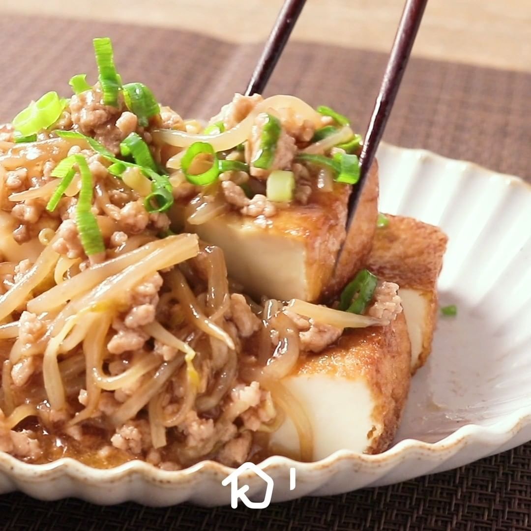 ⑤節約メニュー!ひき肉ともやしのトロトロあんかけ厚揚げ