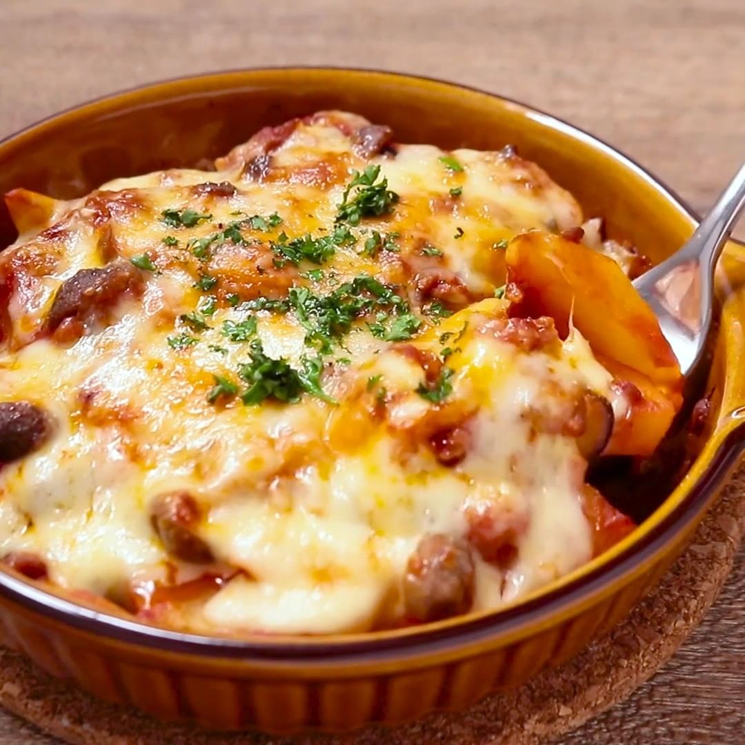①ひき肉ときのことじゃがいものチーズ焼き