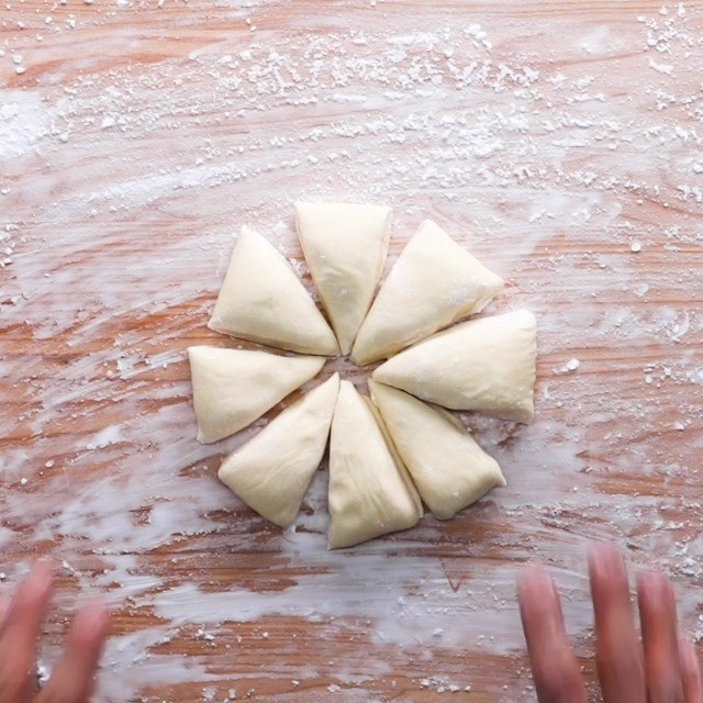4.台に打ち粉を振り、(2)を8等分に分ける。ひとつずつ丸めてめん棒で直径12cmの円形に伸ばす。