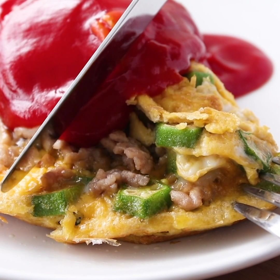 ④オクラとひき肉のふんわりオムレツ