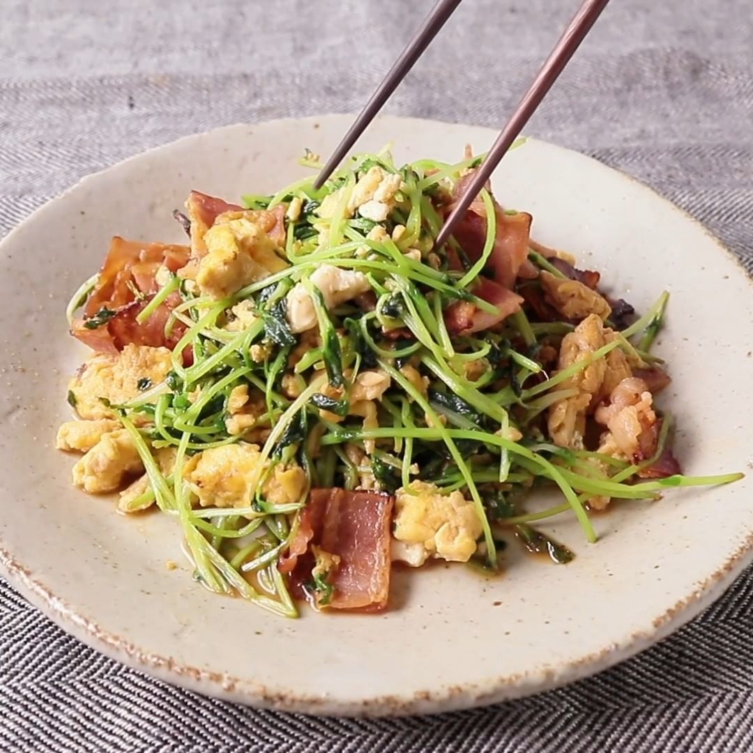 ⑥簡単 豆苗とベーコンの卵炒め