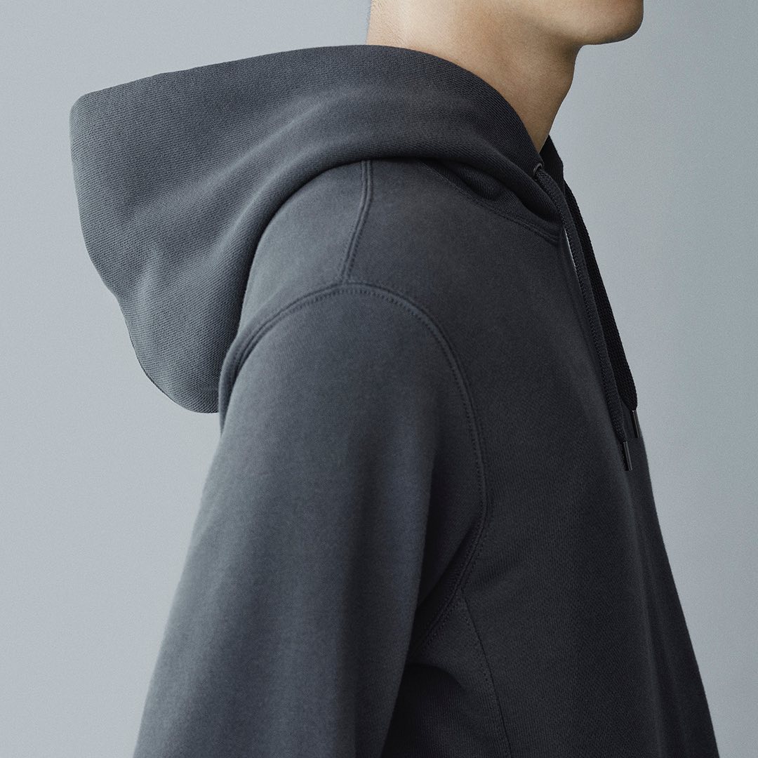 The hood is what makes the look for a sweat hoodie. We researched how to make a hood that looks great from any angle, whether from the front, the back, or the side. The first thing we focused on was designing a three-dimensional pattern. The hood is firm enough to prevent it from spreading out too wide. Another key point is how thick and stiff the fabric is. We tried out numerous ideas for materials with the best balance of a firm hood and a soft fabric. We took all sorts of approaches, such as raising the hood’s inner fabric. By blending polyester only into the hood’s inner fabric, we made a design that is delightfully easy to dry after washing. Our passion for the hood is unmatched.