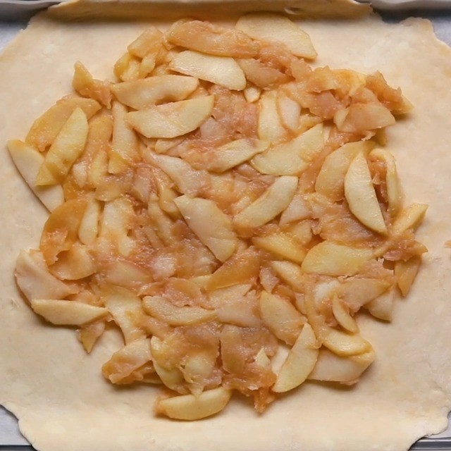 4. りんごフィリングを作る。フライパンを中火にかけ、りんご、レモン汁、シナモン、砂糖を入れて10分炒める。バターを加えて混ぜ合わせ、火から下ろして冷ます。
