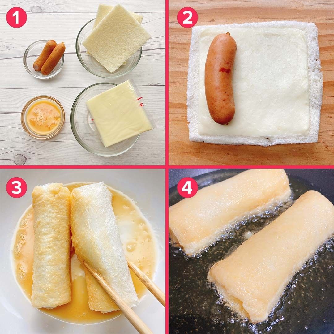 ①チーズがとろ〜り伸びまくる!揚げずに食パンで巻いて焼くだけ!ふんわりチーズドッグ
