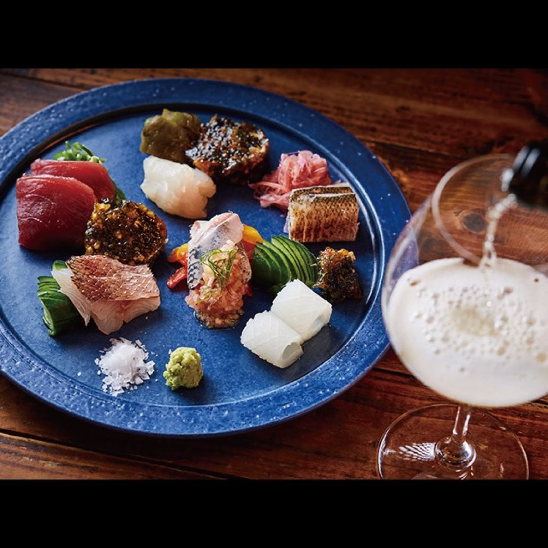 そんなこだわりが凝縮したひと皿が、「カルパッチョの盛り合わせ」1,580円(1人前)。この日は、青森のアイナメや長崎のマダイ、銚子のマグロなど旬の鮮魚が6種類。生海苔のジュレを乗せて食べるのもよし、出汁に浸した野菜と合わせるのもよし、様々な食べ方を愉しめ最後まで飽きさせない。