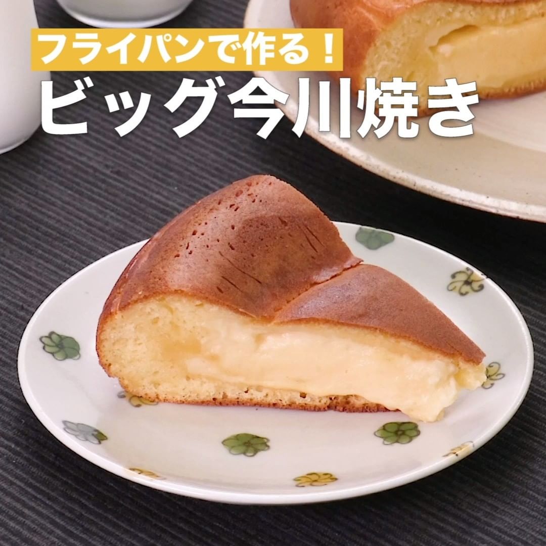 今川焼きは全国でいろんな呼び名があります。フライパンで作るビッグな今川焼きのレシピです。型なしで作れるのがうれしい♪中からとろけ出すカスタードクリームがたまらない一品です。