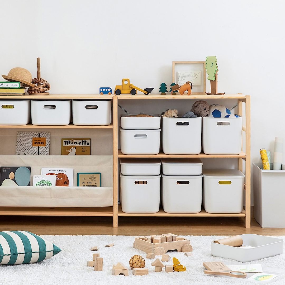 角がまるく、やわらかなポリエチレン素材でつくられているため、こどもが動き回る場所や、高い位置にしまう収納にも。