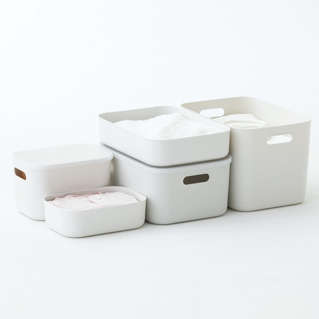 つや消し調の質感と白い色を持つ、やわらかポリエチレンケースは、中に入れたものを隠して収納できるため、空間をすっきりと見せてくれます。