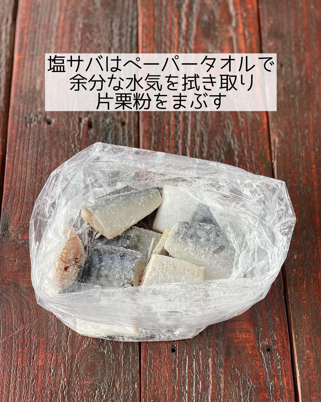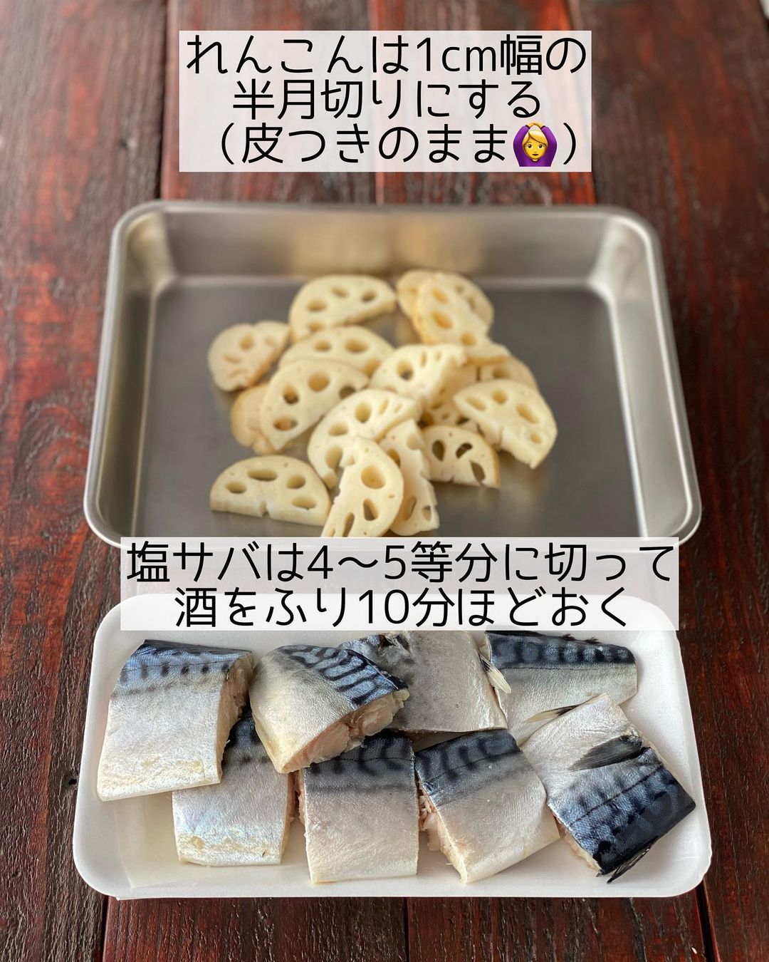 ➊塩サバは𝟺〜𝟻等分に切って酒をふり、𝟷𝟶分ほどおいて片栗粉をまぶす(ポリ袋でまぶすと少ない量でまんべんくまぶせます)。れんこんは𝟷𝚌𝚖幅の半月切りにする。