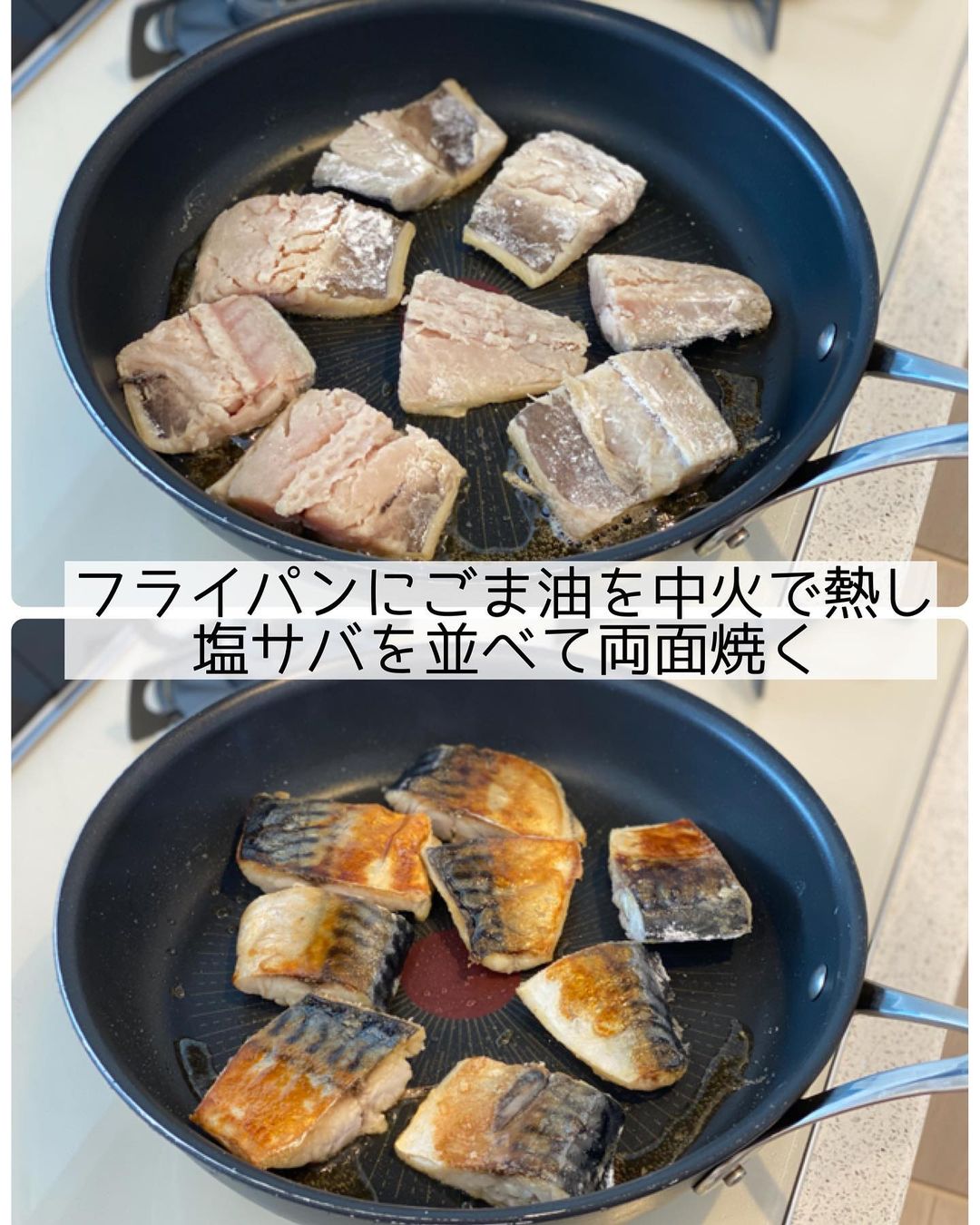 ➋フライパンにごま油を中火で熱し、サバの皮目を下にして並べる。𝟸分ほど焼いたら裏返し、もう片面も𝟸分ほど焼いて一旦取り出す。
