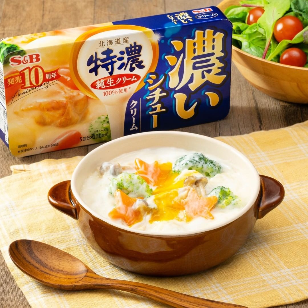 じっくり煮込んだ食材と牛乳のコクに「S&B 濃いシチュー」の濃厚なクリームが溶けこみ、より一層濃いクリームシチューが楽しめます✨