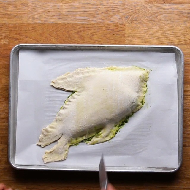 6. 頭部分を1度折り返し、(B)を塗ってパイ生地の切れ端をのせる。もう一つ切れ端を重ねて(B)を塗ったら、頭部分のパイ生地を折り戻す。