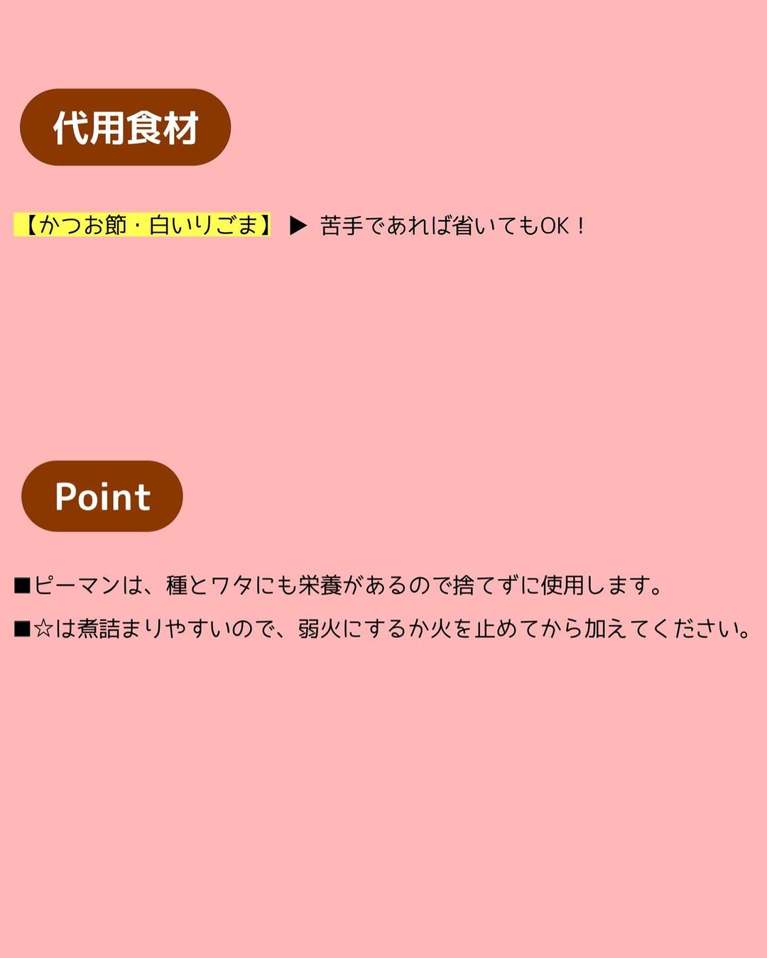 甘じょっぱさにピーマンの苦味がアクセントになり、飽きずに最後まで食べられます😋💕 ごまとおかかも香ばしく、これだけでご飯がすすみますよ〜(⁎˃ᴗ˂⁎)✨