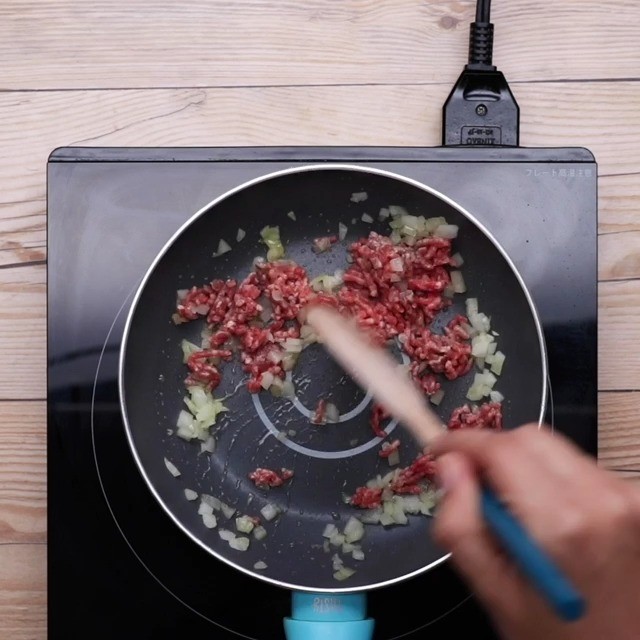 1.玉ねぎはみじん切りにして、フライパンにオリーブオイルを熱して炒め、しんなりしたらひき肉も一緒に炒めて塩、コショウを加える。