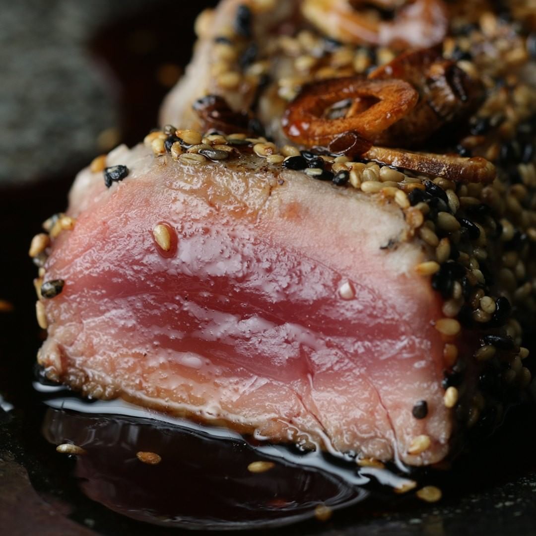 6. Arrange sliced tuna on a plate with garlic chips on top, spoon sauce over tuna.