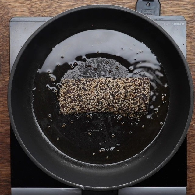 2. Mix both sesames seeds in a tray. Put tuna in the tray to coat with sesame seeds.