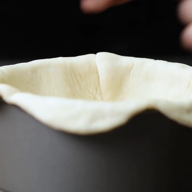 8.型に薄くオリーブオイル(分量外)を塗り、(7)の生地を敷き込む。ラップをかけ、10分ほど置く。(二次発酵)