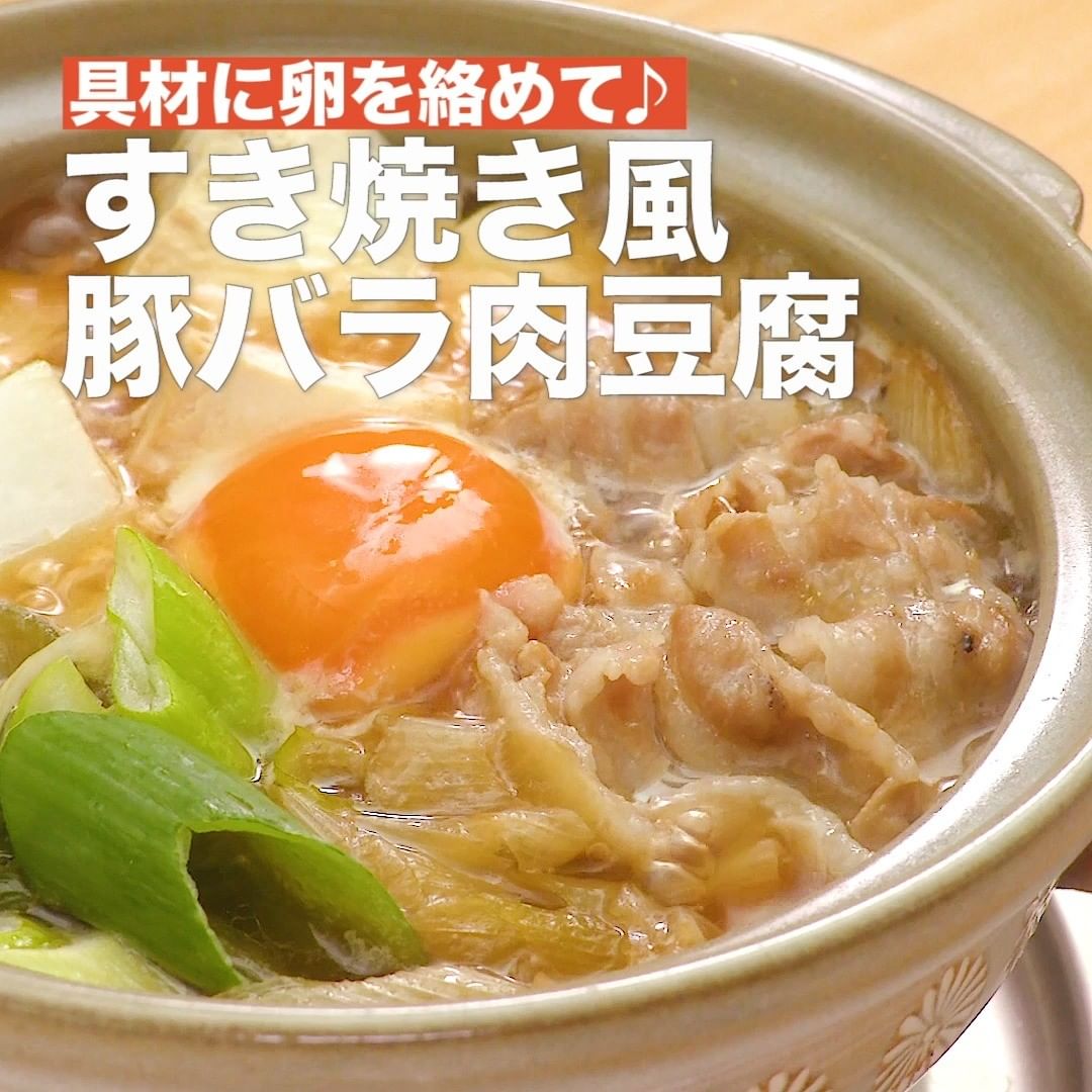 肌寒い日に食べたいすき焼き風の絶品おかず♪豚バラ肉のコクが豆腐や野菜にしみ込んだご飯がすすむ一品です。くったりと煮えた野菜に卵を絡めて食べれば、たまらない美味しさ!ご飯の上にのせて丼にするのもおすすめです。