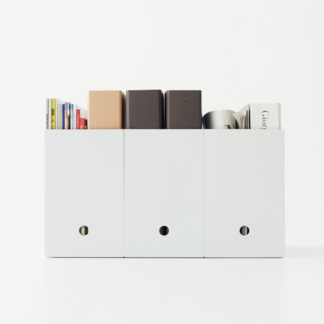 ホワイトグレーのファイルボックスは、中身を隠してしまえるため、ごちゃつきを抑えたい場所の収納に取り入れると、空間をすっきりと整えてくれます。