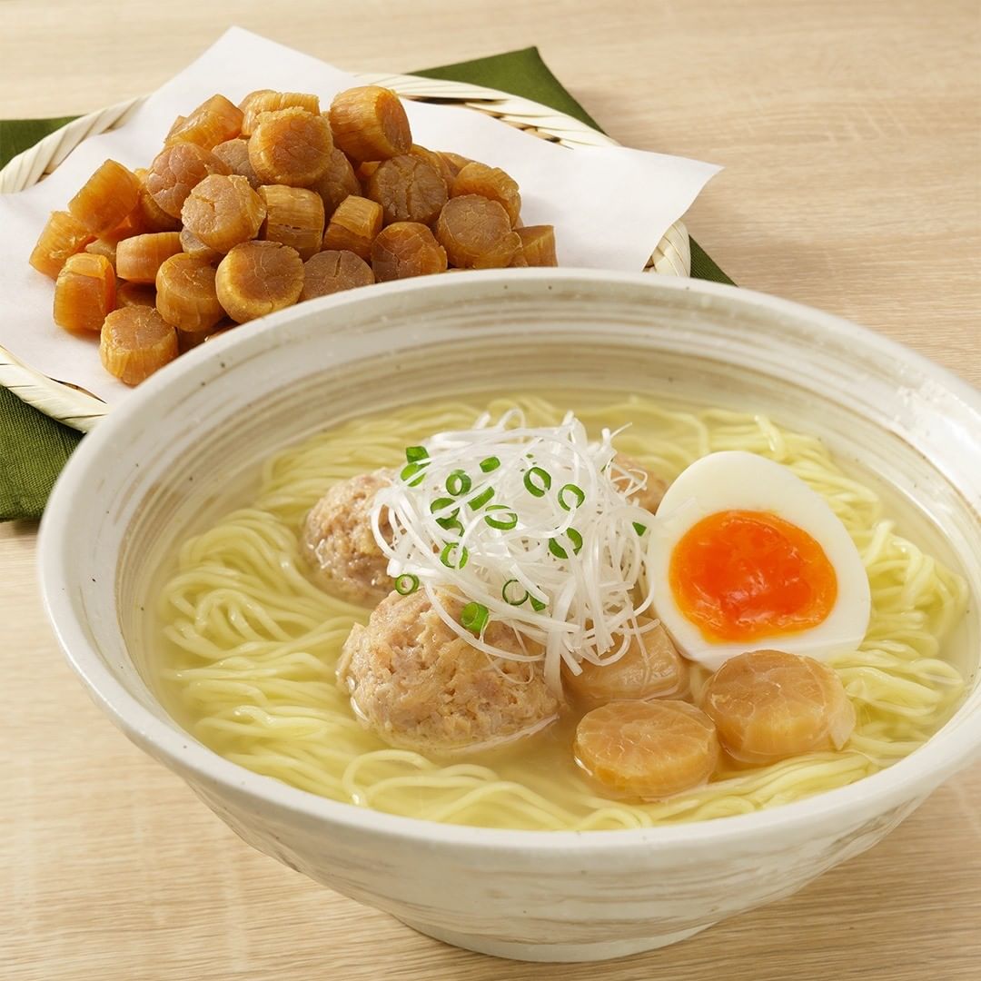 ほたて鶏だんごの旨塩ラーメンのご紹介です。旨みが凝縮されたほたて干貝柱をふんだんに使った、味わい深い一品です。シンプルな塩味のスープにほたて干貝柱のだしが溶け込み、何度でも食べたくなるおいしさですよ。戻したほたて干貝柱を鶏団子にも入れることで、風味が増し、ほたての食感が良いアクセントになります。普段よりワンランク上のラーメンを、ぜひお試しくださいね。