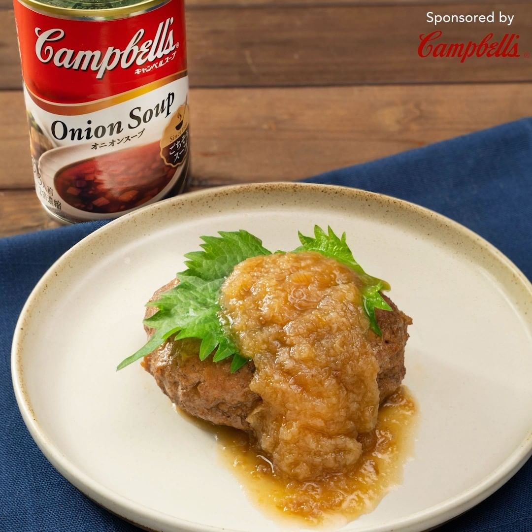 肉汁溢れる!和風おろしハンバーグのご紹介です。玉ねぎの甘みやコクが詰まった「キャンベル濃縮缶 オニオンスープ」を肉だねに入れることで、旨みたっぷり、ふんわりジューシーに仕上がります。玉ねぎを刻んで炒める手間が無い、お手軽レシピです。濃厚な「キャンベル濃縮缶 オニオンスープ」は、さっぱりとした大根おろしにもよく合い、ハンバーグを焼いている間にレンジでソースを作ることができますよ。この機会にぜひお試しくださいね。