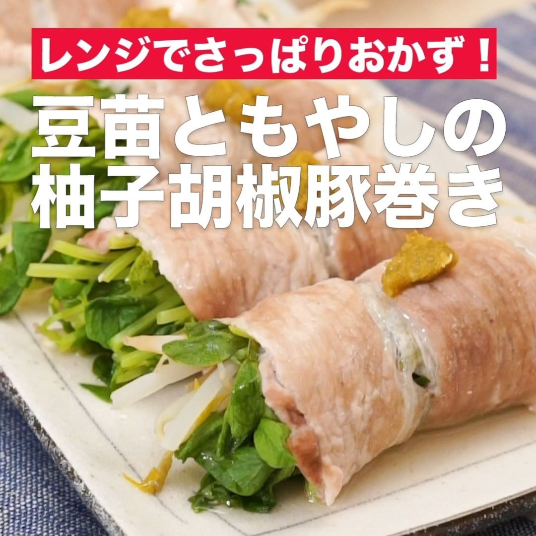 ④<レンジでさっぱりおかず!豆苗ともやしの柚子胡椒豚巻き>