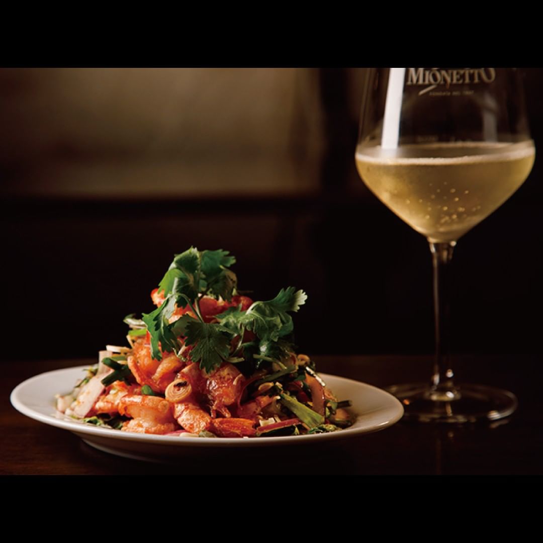 「揚げ海老とレモングラスのサラダ」710円は、カリッと揚げた海老に、ハーブの風味と辛味、甘みを利かせた、おつまみに最適な一品。パクチーやレモングラスの香りや、後からじわじわくる辛さが、「ミオネット」680円のやわらかな味わいとほろ苦い余韻と合わさり、絶妙なハーモニーを生む。