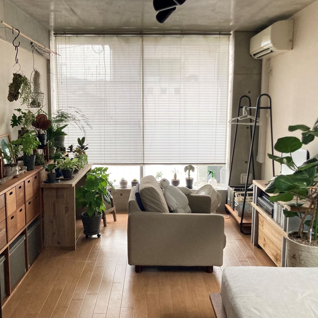 8畳のワンルームにワークスペース・一人掛けソファでのくつろぎスペース・趣味のインテリアグリーンコーナーなど、自身のお気に入りを詰め込んでいます。壁面にはスタッキングシェルフを使い、収納をまとめることで、その周りに置くお気に入りの植物たちが際立つようにしています。整える場所と飾る場所のメリハリをつけるのがポイントです。