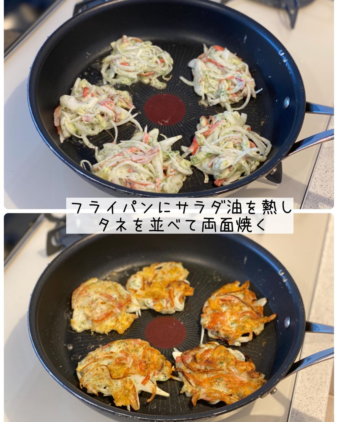 ➌フライパンにサラダ油を中火で熱し、2をスプーンなどですくい、平らにして広げて入れる。焼き色がついたら裏返し、もう片面も焼き色がつくまで焼く。お好みでマヨネーズを添えてお召し上がりください。