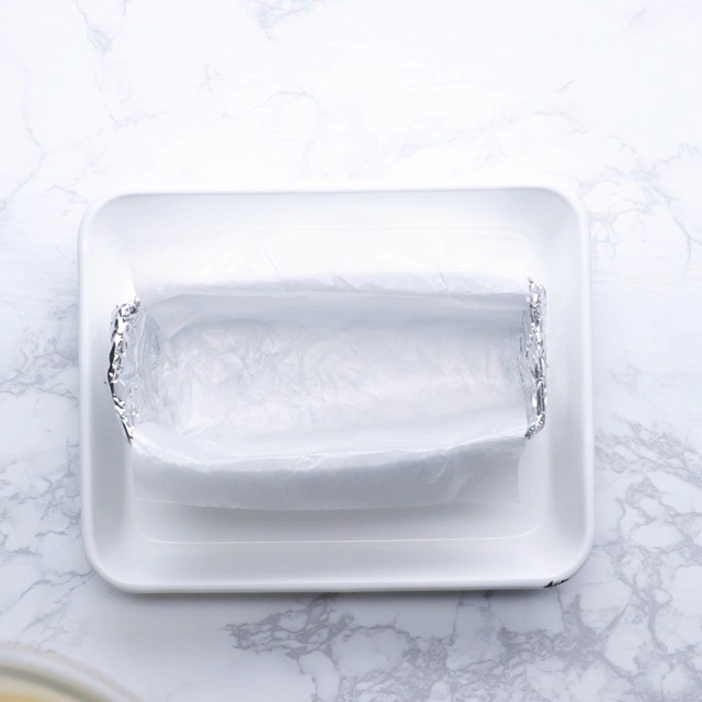 2.紙パックは一面だけ切り、上部をホチキスで止めてパウンド型にする。全体をアルミホイルで覆って、中にクッキングシートを敷いておく。