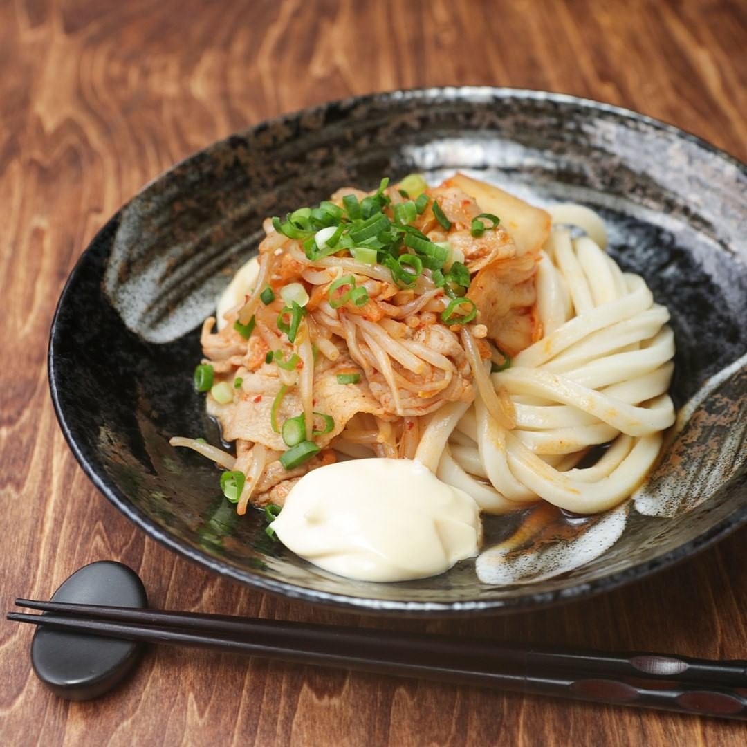 4.うどんの上からめんつゆをかけ、豚キムチをのせる。万能ねぎを散らし、マヨネーズを添えたら、完成!